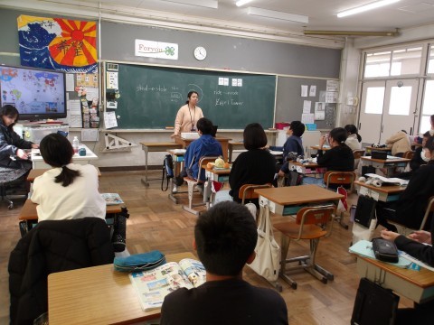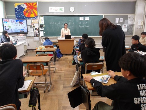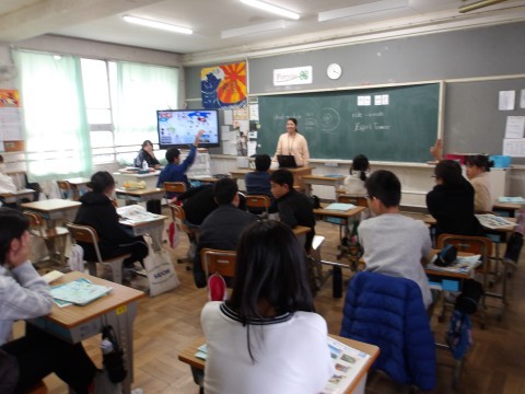 世界の国々について学んでいました。イギリスのビッグベンやオーストラリアのシドニーオペラハウスなど,知らない人が多かったです。これからたくさん世界について知ってください!