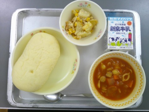 今日の献立は、オリーブパン、牛乳、ミネストローネ、ツナとポテトのマヨネーズ風味焼きです。