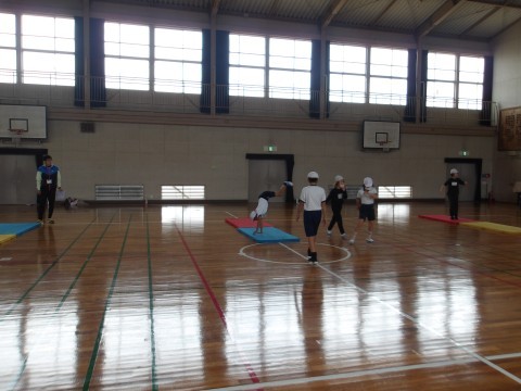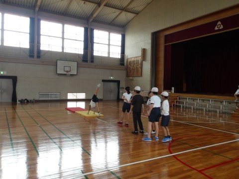 マット運動をしていました。倒立前転・開脚前転・開脚後転・倒立など,技を自分で選んでチャレンジしていました。