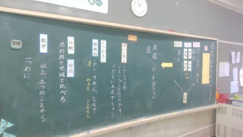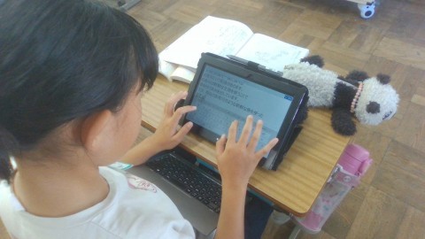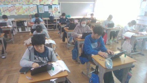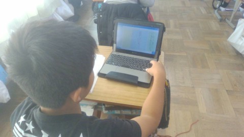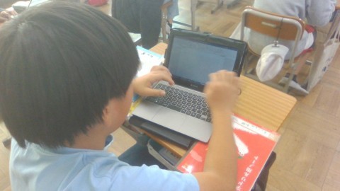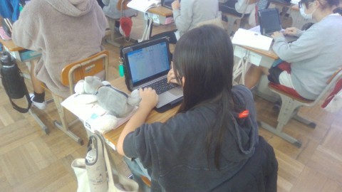 この学習では,考えを効果的に伝えるための工夫を学び,日本文化の魅力を伝えるというテーマに基づいて,よさを伝える文章を書きます。説明する文章の構成を簡単におさらいした後,児童用端末を使用して文章を書いています。