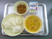 今日の献立は、ご飯、牛乳、ハヤシライス、ポテトサラダです。