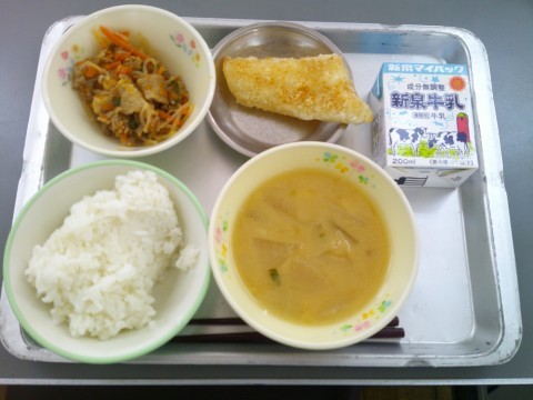 今日の献立は、ご飯、牛乳、みそ汁、糸こんにゃくのうまに、カレイのから揚げです。