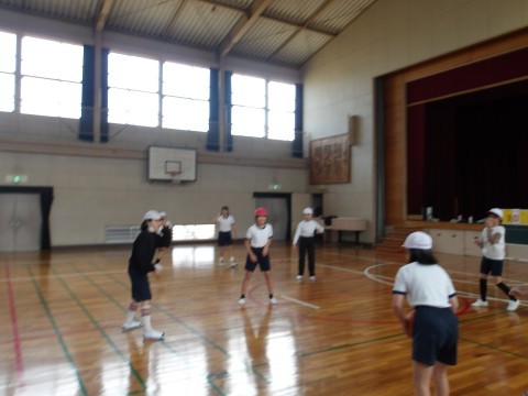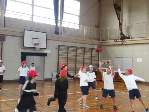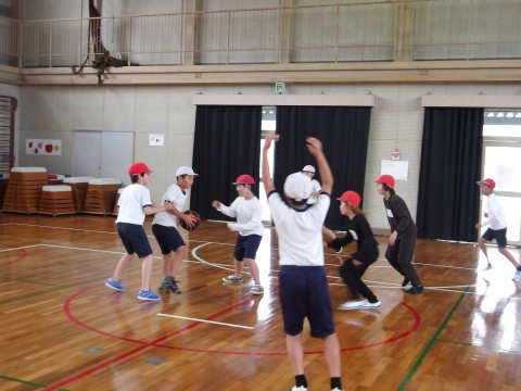 バスケットボールを試合形式で練習していました。声を出し合って素早いパスを心がけていました。