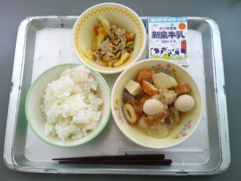 今日の献立は、ご飯、牛乳、みそおでん、大阪しろなと豚肉の煮びたしです。