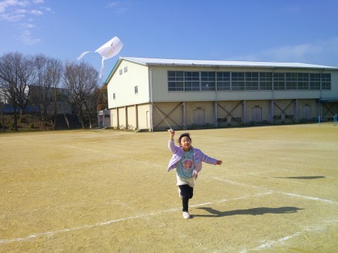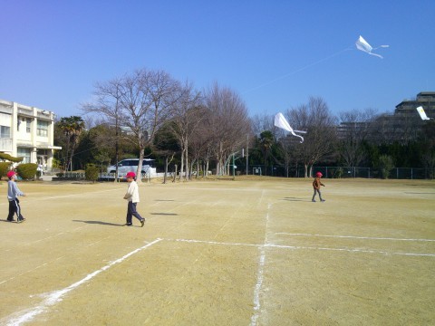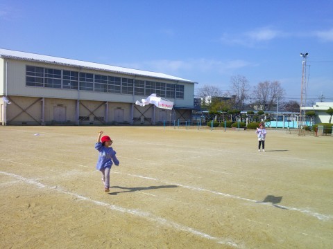 みんな元気いっぱい凧揚げをしました。一生懸命走って凧を空高く飛ばしていました。