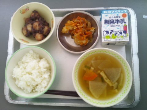 今日の献立は、ご飯、牛乳、のっぺい汁、鳥から揚げの野菜あんかけ、しらたまぜんざいです。