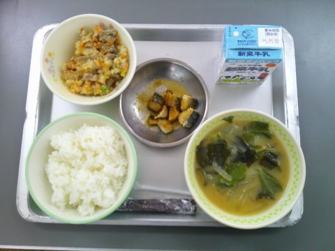 今日の献立は、ご飯、牛乳、みそ汁、うの花、焼きサバのみぞれがけです。