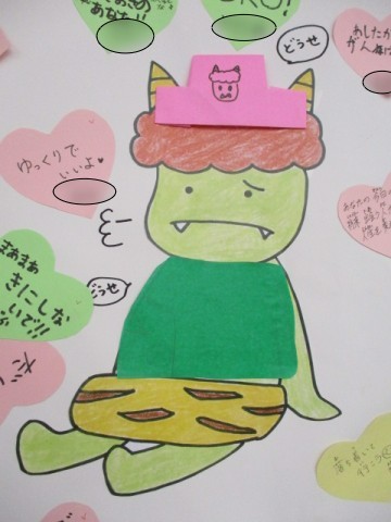 2月の保健室前掲示物の「どうせ鬼をはげまそう」は、「どうせできないし・・・」と、悲しくなったどうせ鬼をはげますための言葉をみんなで考える掲示物になっています。