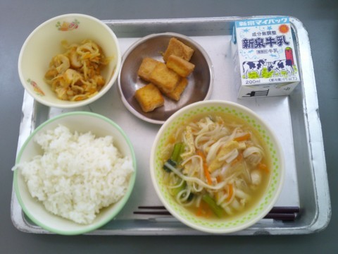 今日の献立は、ご飯、牛乳、ごもくにゅうめん、切り干し大根の煮物、あつあげのしょうがやきです。