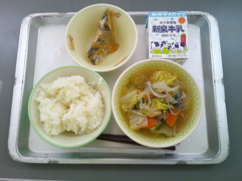 今日の献立は、ご飯、牛乳、寄せ鍋、さばの味噌煮です。