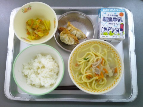 今日の献立は、ご飯、牛乳、とんこつラーメン、キャベツのソテー、焼きギョーザです。