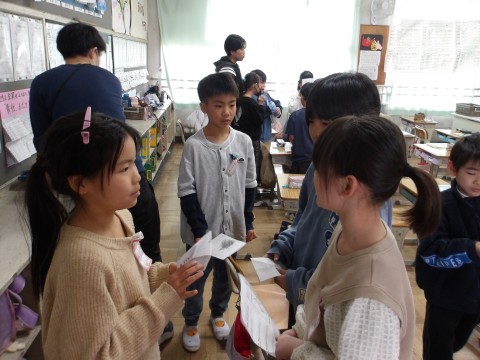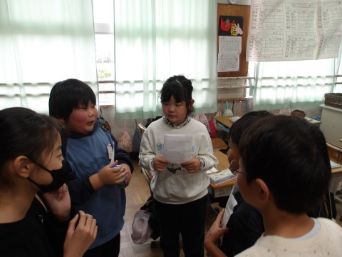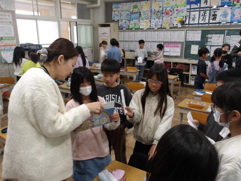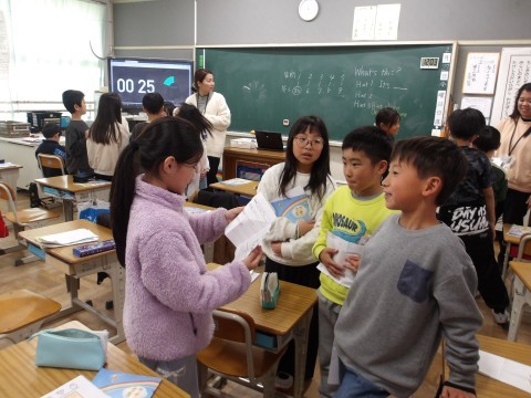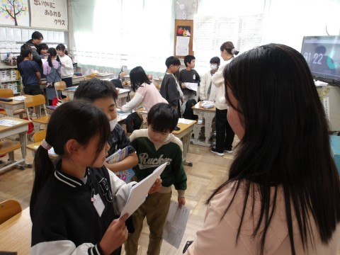 英語で3つのヒントを出して,答えを英語で伝える「3ヒントクイズ」をしました。とても盛り上がっていました。