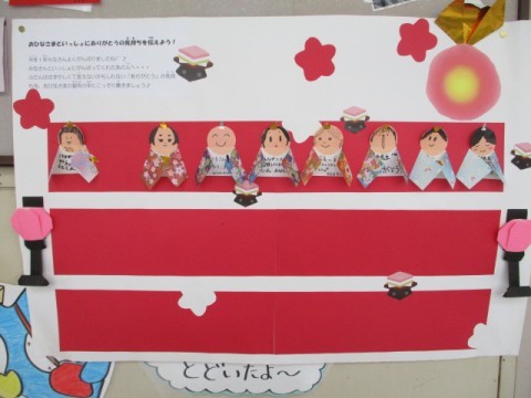 もう一つは、お世話になったあの人へ・・・。ありがとうの気持ちを込めたひな人形を子どもたちに書いてもらっています!担任の先生やおうちの人へ向けたありがとうを見て、うれしくなりました♪