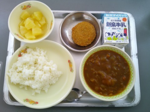 今日の献立は、ご飯、牛乳、チキンカレーライス、ミンチカツ、パインコンポートです。