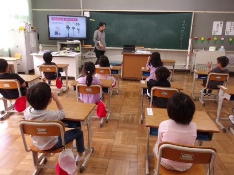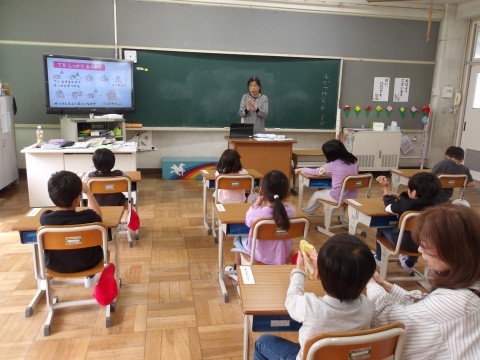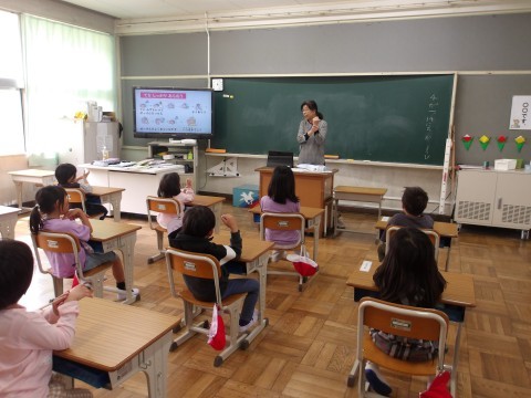 栄養教諭の先生に,明日から始まる給食の準備の仕方について教わりました。食事の前の手洗いやエプロンへの着替えを頑張りましょうね。