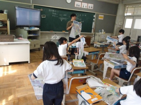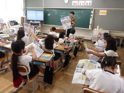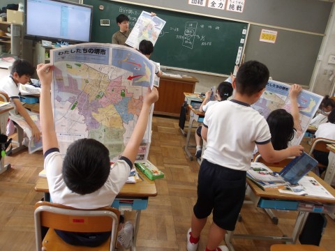 初めての社会科の授業でした。堺市の大きな地図を見ながら,まずは竹城台東小学校の位置を,一生懸命探していました。