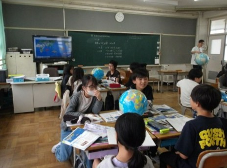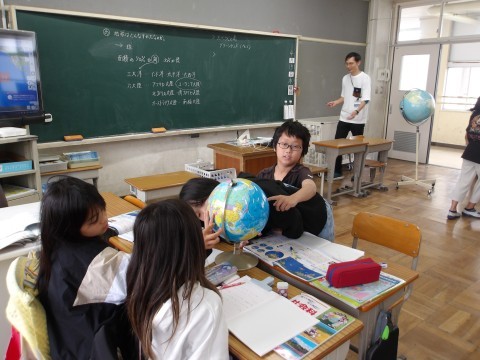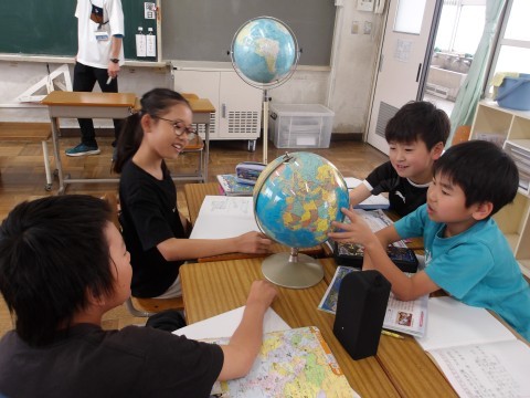 地球儀を見ながら,地球の特徴について考えました。子どもたちは地球儀で調べることに興味深々でした。