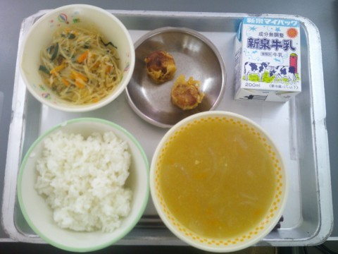 今日の献立は、ご飯、牛乳、中華コーンスープ、はるさめの炒め煮、あげシューマイです。