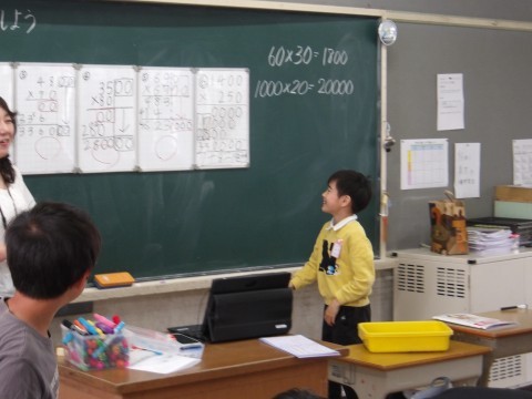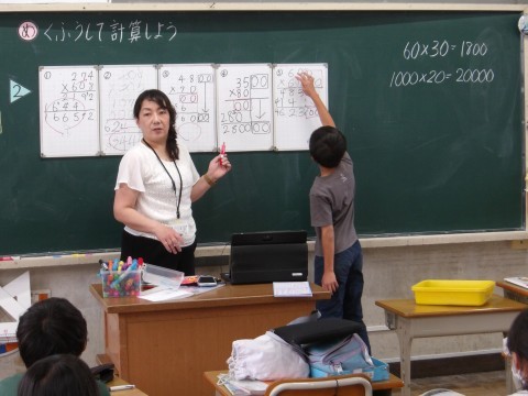 かけ算の筆算を工夫して計算する方法を考えました。子どもたちから様々なアイデアが出ていました。