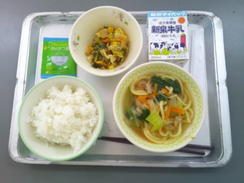 今日の献立は、ご飯、牛乳、ごもくラーメン、小松菜サラダ、ふりかけです。