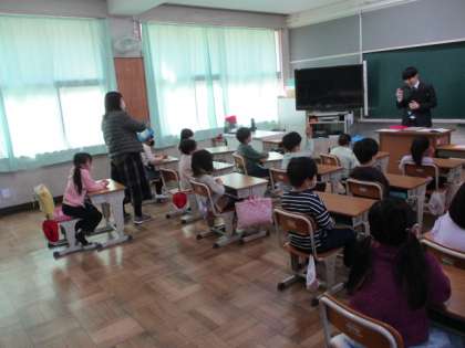 2年生の教室でのようすです。新しい担任の先生のお話を聞いていました。