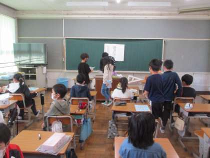 5年生の教室での様子です。今日持ってきたものを、先生が集めていました。