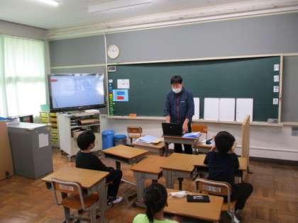 パワーポイントを使って先生は説明をしています。こどもたちは、先生の話を聞いています。