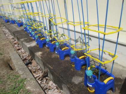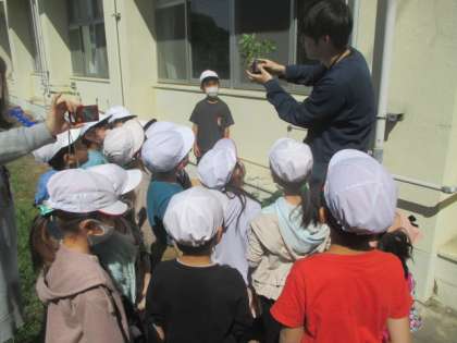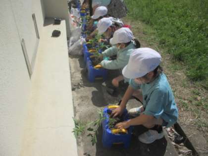 ピーマン、なす、ミニトマト、きゅうりの苗(なえ)をうえました。「たくさん、そだちますように。」