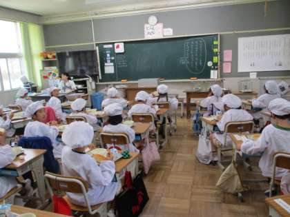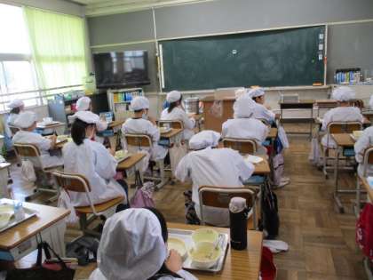 給食時間の様子です。準備が終わって、みんなで食べています。
