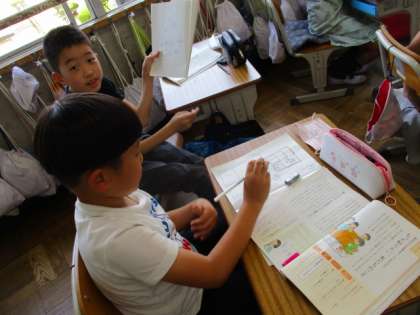 『もっと知りたい、友だちのこと』の学習のために、自分が話したいことを「いつ・どこで・だれが・何を・どうした」「なぜかというと」などを意識して自分の発表文を考え始めました。