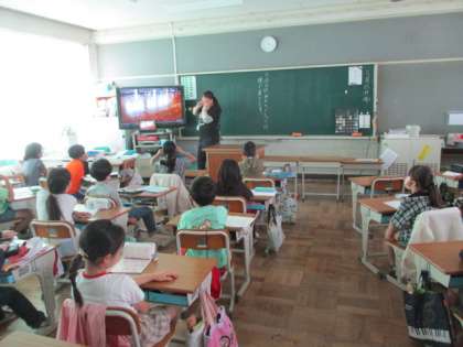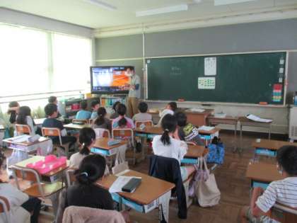 教室で自分たちの団体演技練習のビデオを見て、気づいたことを話し合いました。