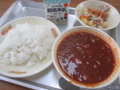 「ごはん、牛乳、ハヤシライス、ポテトサラダ」