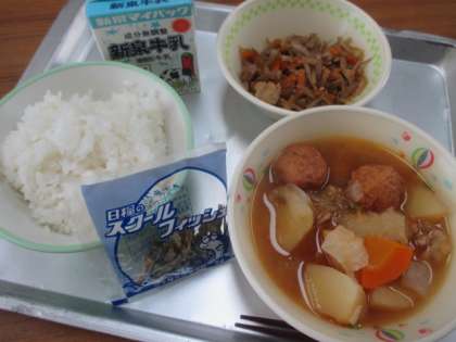 「ごはん、牛乳、豚肉と野菜のしょうが煮、きんぴらごぼう、ミニフィッシュ」