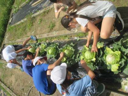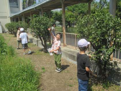 アゲハやモンシロチョウに食べさせるために、キャベツや、キンカンの葉っぱをさがしていました。