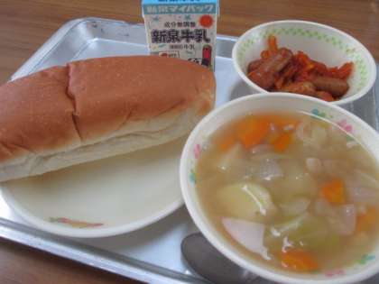 「コッペパン、牛乳、ポトフ、ウィンナーのトマト煮」