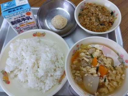 「ごはん、牛乳、かきたま汁、ソイ丼、ごまだんご」