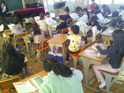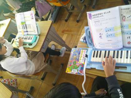 けんばんハーモニカで、「ドレミファソ」のゆびづかいを学(まな)びます。