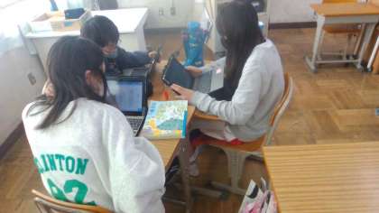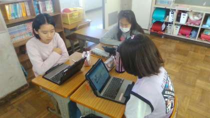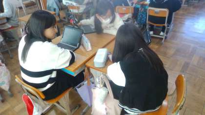 鳥獣戯画の最後の授業です。選んだ絵を評価・表現したものを、タブレットを使って共有しました。友だちの発表を真剣に聞いていました。一人ひとりの個性が出ていて、おもしろかったです。