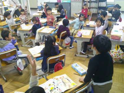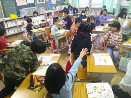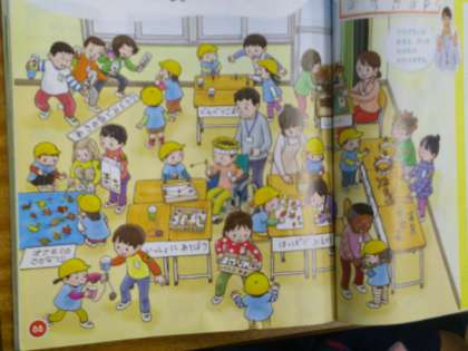 あきのおもちゃづくりをかんがえます。やじろべえ、はっぱでおえかき、どんぐりめいろ・・。 たくさんのはっぴょうが、ありました。
