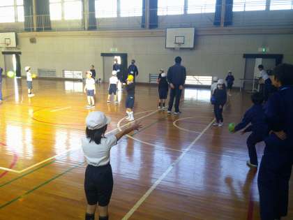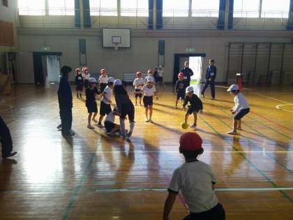 体育館で、ボールキャッチのあと、ドッジボールです。