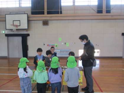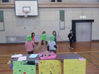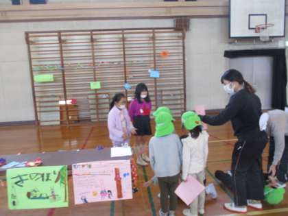 竹城台東保育園の年長さんに、2年生のおもちゃランドに来ていただきました。2年生が考えたカエル・きのぼり・ひこうき・ロケット・くるまの5種類のおもちゃで交流することができました。お互いに楽しい時間を過ごすことができました。