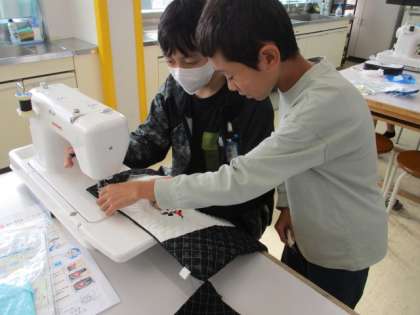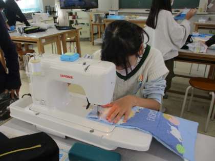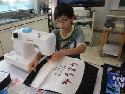 ナップザック作りに取り組んでいます。今日は「わき」と「出し入れ口」を縫いました。