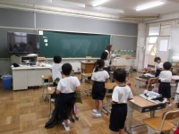 1年生は体育,2年生は算数,3年生は国語の学習をしていました。1年生は上手にお着...