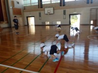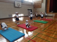 体育館でマット運動をしていました。何度も勢いよく,前回りの練習を頑張っていました...