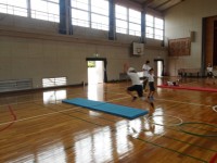 走り幅跳びの練習の一環として,片足踏み切り,腕を上げてジャンプ,両足で着地の練習...
