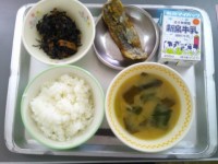 今日の献立は、ご飯、牛乳、みそ汁、ひじきの甘煮、さんまのかば焼き風です。さんまは...