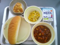 今日の献立は、ミニコッペパン、牛乳、ビーンズシチュー、コーンキャベツ、さつまいも...