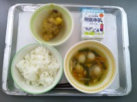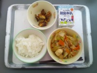 今日の献立は、ご飯、牛乳、ニラとうずら卵のスープ、鶏肉とさつまいものピリ辛煮です...