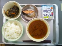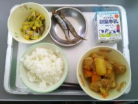 今日の献立は、ご飯、牛乳、豚肉と野菜の生姜煮、小松菜と白菜の炒め煮、焼きししゃも...