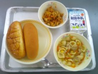 今日の献立は、オリーブパン、牛乳、ミネストローネ、ツナとポテトのマヨネーズ風味焼...